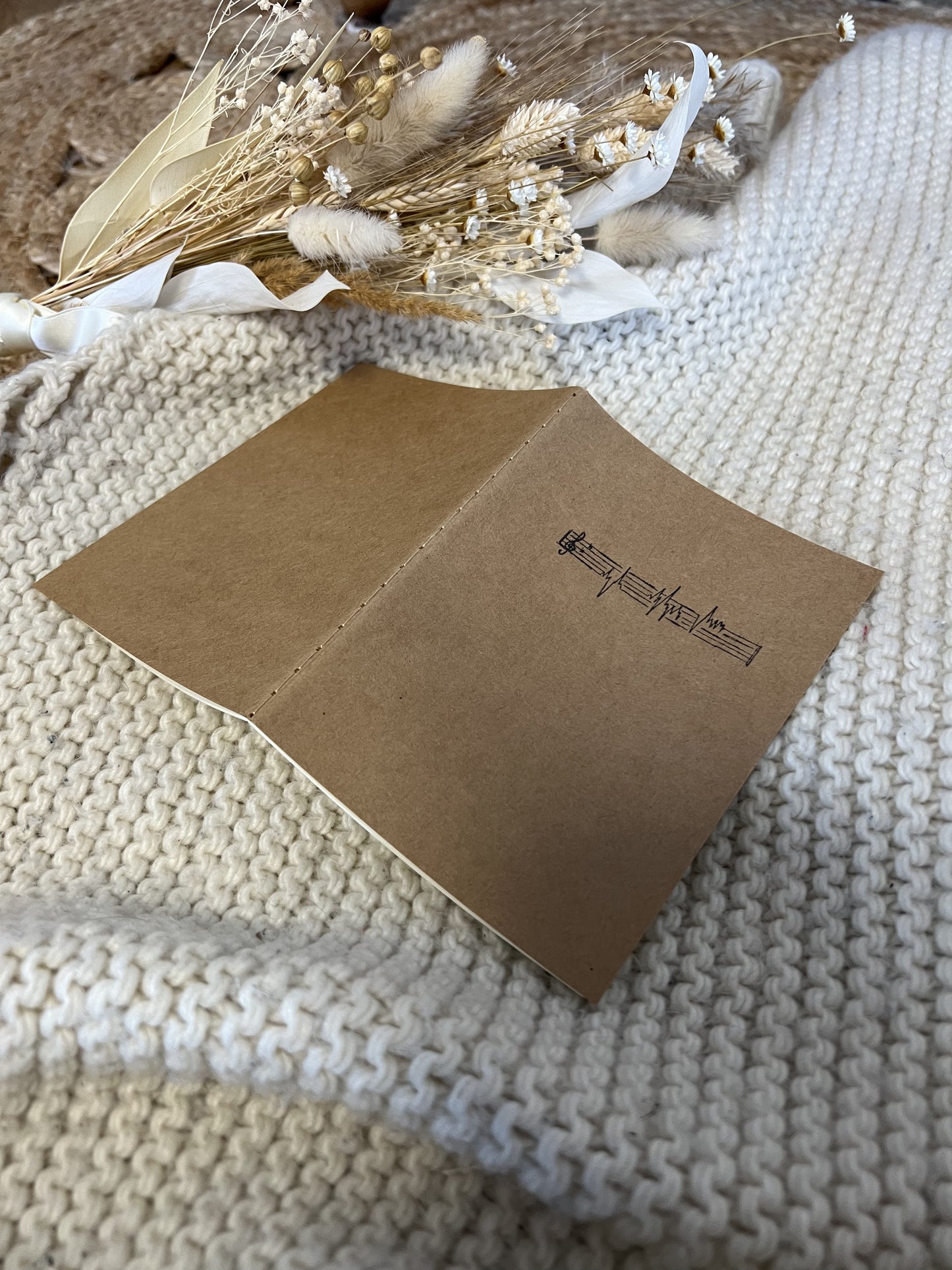 Der Buchrücken ist genäht und das Heft ist mit einem, von mir selbst gezeichneten Design bestempelt.